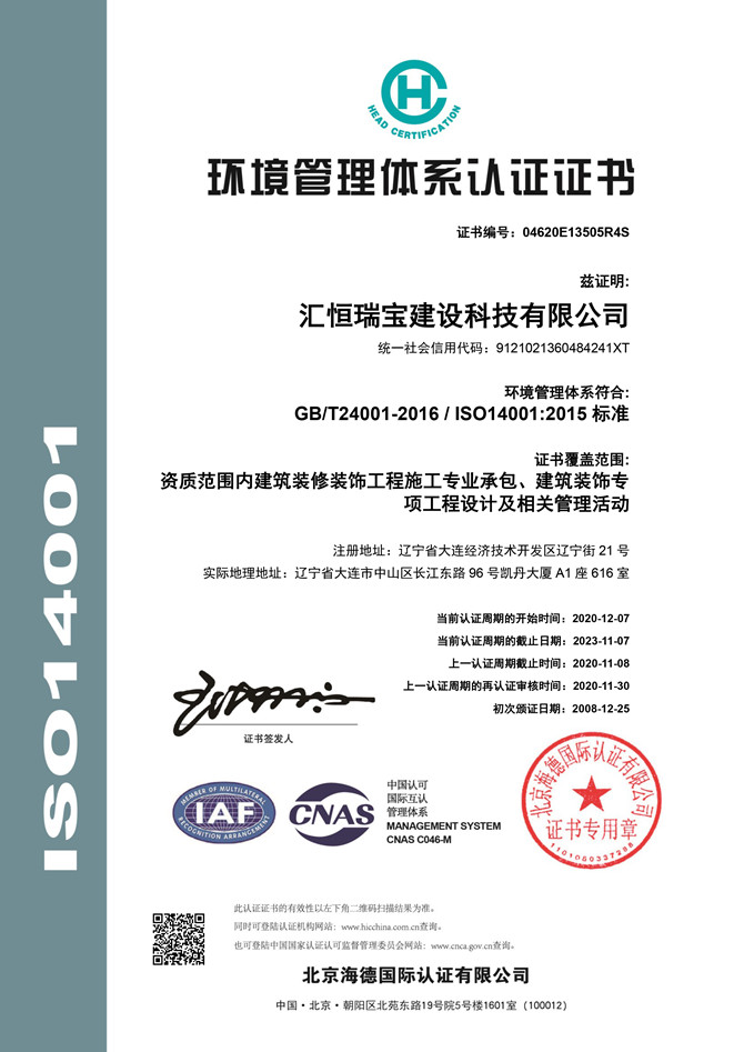 環(huán)境管理體系認(rèn)證證書